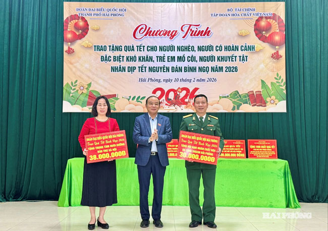 Ngoài việc tích cực vận động các doanh nghiệp hỗ trợ kinh phí cho người nghèo, hộ cận nghèo, người có hoàn cảnh đặc biệt khó khăn, trẻ em mồ côi, người khuyết tật trên địa bàn thành phố, đón xuân năm mới Bính Ngọ 2026, Đoàn đại biểu Quốc hội thành phố đã trích nguồn kinh phí của Đoàn để tặng 40 triệu đồng cho 80 đối tượng chính sách, gia đình có công tại 04 xã, phường: Nghi Dương, Vĩnh Thịnh, An Biên và Đông Hải; tặng 60 triệu đồng cho 90 đối tượng nạn nhân chất độc da cam/dioxin thành phố; tặng 38 triệu đồng cho 76 đối tượng là người già khuyết tật neo đơn (thông qua Hội Bảo trợ người khuyết tật và trẻ mồ côi thành phố Hải Phòng); tặng 05 triệu đồng cho Trung tâm Nuôi dưỡng Bảo trợ xã hội Hải Dương (thuộc Sở Y tế thành phố Hải Phòng); tặng 05 triệu đồng cho Trung tâm Điều dưỡng người tâm thần Hải Dương, tổng kinh phí là 148 triệu đồng.